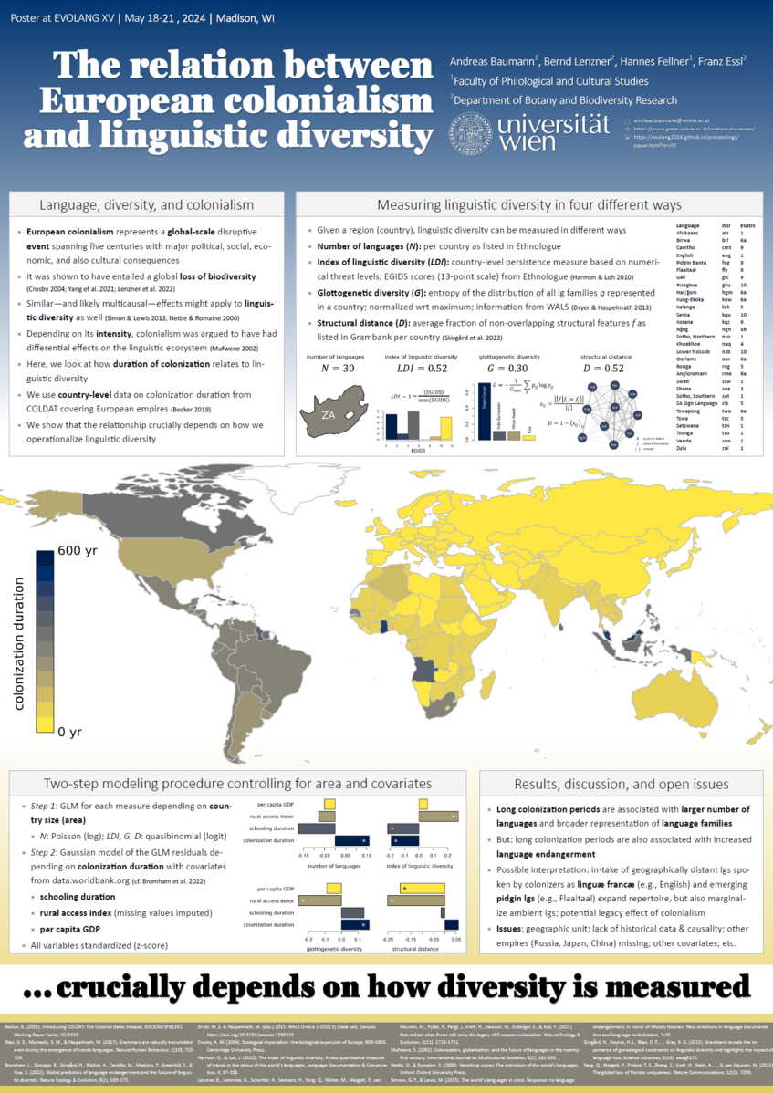 - Baumann, A., Lenzner, B., Fellner, H. A. & Essl, F. 2024. The relation between European colonialism and linguistic diversity. Poster at EVOLANG XV, Madison, WI.